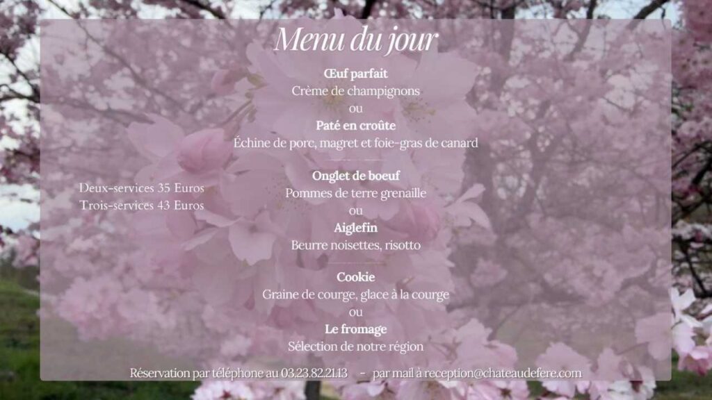 Les réservations se font par email à reception@chateaudefere.com ou par téléphone au 03 23 82 21 31 .