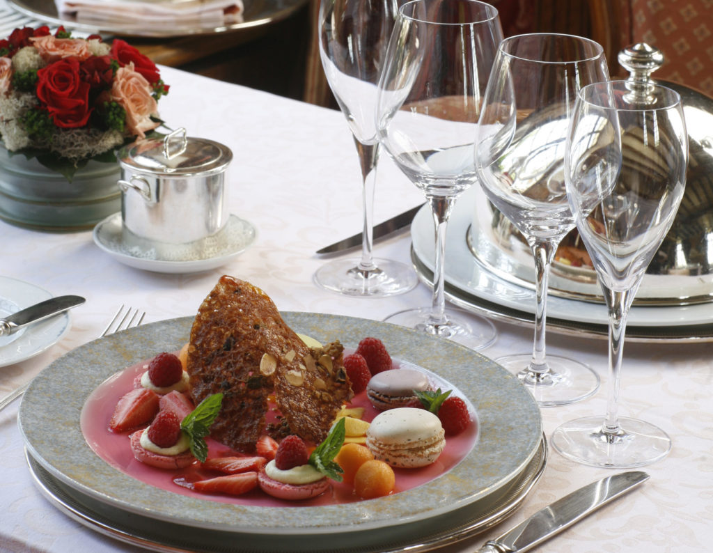 Chaque menu raconte une histoire, entre tradition et créativité, où les saisons dictent le rythme et les saveurs guident l’inspiration. Le cadre historique du restaurant, installé dans un bâtiment du XVIIe siècle, invite à la dégustation dans une atmosphère élégante et intemporelle. Les terrasses offrent une vue imprenable sur les ruines médiévales du château et le parc, ajoutant une touche de magie à chaque repas.