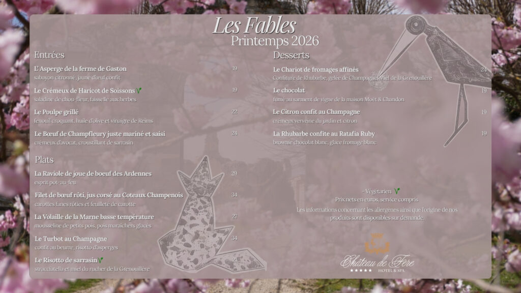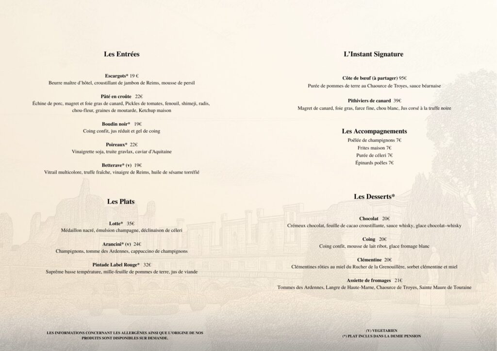 Le menu du restaurant évolue au fil des saisons, au rythme des produits frais et des producteurs locaux mais aussi des évènements spéciaux comme celui de la Saint Sylvestre. Chaque changement de carte est une nouvelle invitation à la découverte culinaire, alliant tradition champenoise et créativité gastronomique.