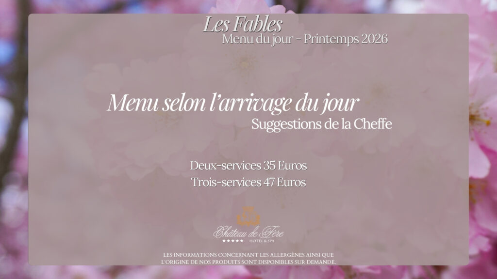 Situé à proximité de Reims, le restaurant Les Fables du Château de Fère s’impose comme une table incontournable pour les amateurs de cuisine gastronomique et de produits du terroir. Sous la direction de la cheffe Marie Eugénie Richer, la carte met à l’honneur une cuisine raffinée, sincère et inspirée, élaborée à partir de produits locaux et frais soigneusement sélectionnés auprès de producteurs régionaux.