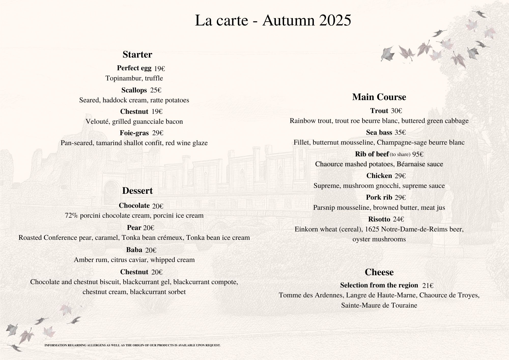 The elegance of the restaurant’s three successive dining rooms, each one with its 17th-century wood panelling and parquet flooring, frescoes paying homage to the fables of Jean de la Fontaine, and majestic period fireplace, makes this gustatory journey of discovery a real delight for the eyes as well as for the taste buds.