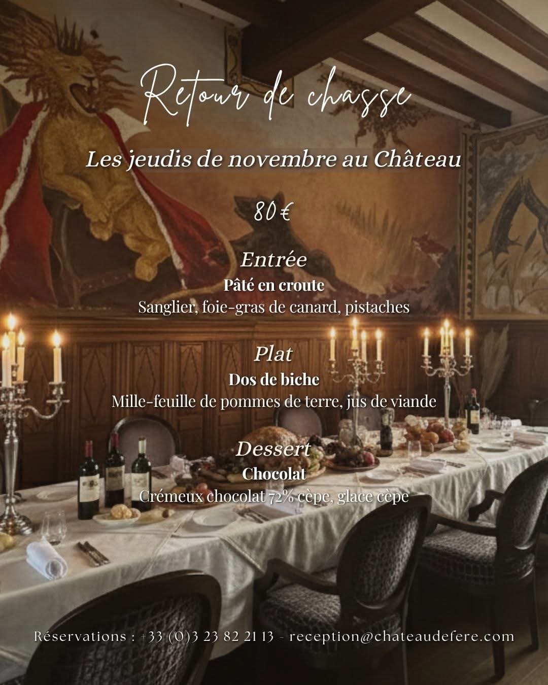 - Réservation obligatoire* : par téléphone au 03 23 82 21 13 ou par email à reception@chateaudefere.com (*Nombre de places limité)